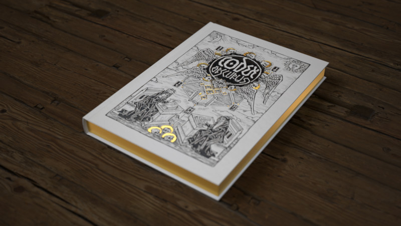 De ce fait, la couverture, aussi bien que l’intérieur et les finitions font du CODEX Obscurus un objet unique. Pour cela, il a fait appel à Viktor Pushkarev qui a créé tout l’univers du CODEX: que ce soit la typographie, le design de la couverture ou des prints réalisés à la main (linogravure et feuille d’or). Le format A4 du livre, vous permettra aisément de le ranger dans votre bibliothèque. La couverture cartonnée imitation cuir est agrémentée d’un marquage à chaud, d’un bel embossage et d’une dorure subtile. Pour ce qui est de l’intérieur, vous y trouverez 304 pages imprimées en couleur sur un papier Arctic Munken en 150g.