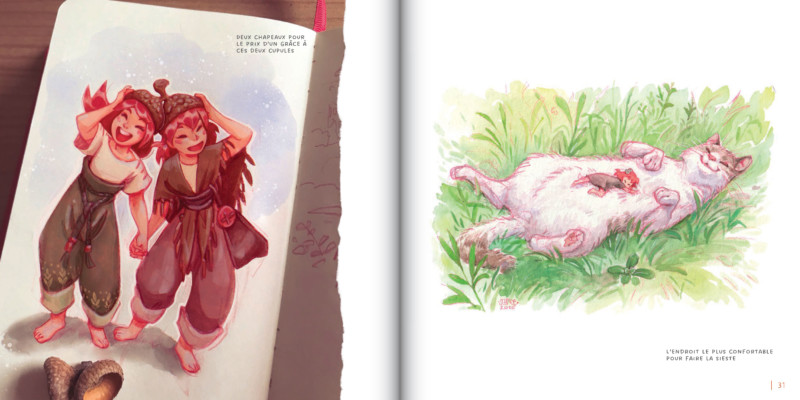 « Des portraits de personnages aux dessins spontanés représentant des moments entre frères et sœurs, vous trouverez de magnifiques illustrations tout au long du livre. Je partage de nombreux dessins issus des défis “Inktober” passés qui m’ont poussée à intégrer les thèmes proposés dans la vie de mes Small People. Je vous montre également les nombreuses illustrations que j’ai réalisées à partir de Philia et de sa célèbre feuille de ginkgo. Je me plonge dans la manière de représenter le mouvement et la danse, tout cela à partir d’une feuille que j’ai ramassée dans mon jardin. L’inspiration vient parfois des endroits les plus inattendus ! »