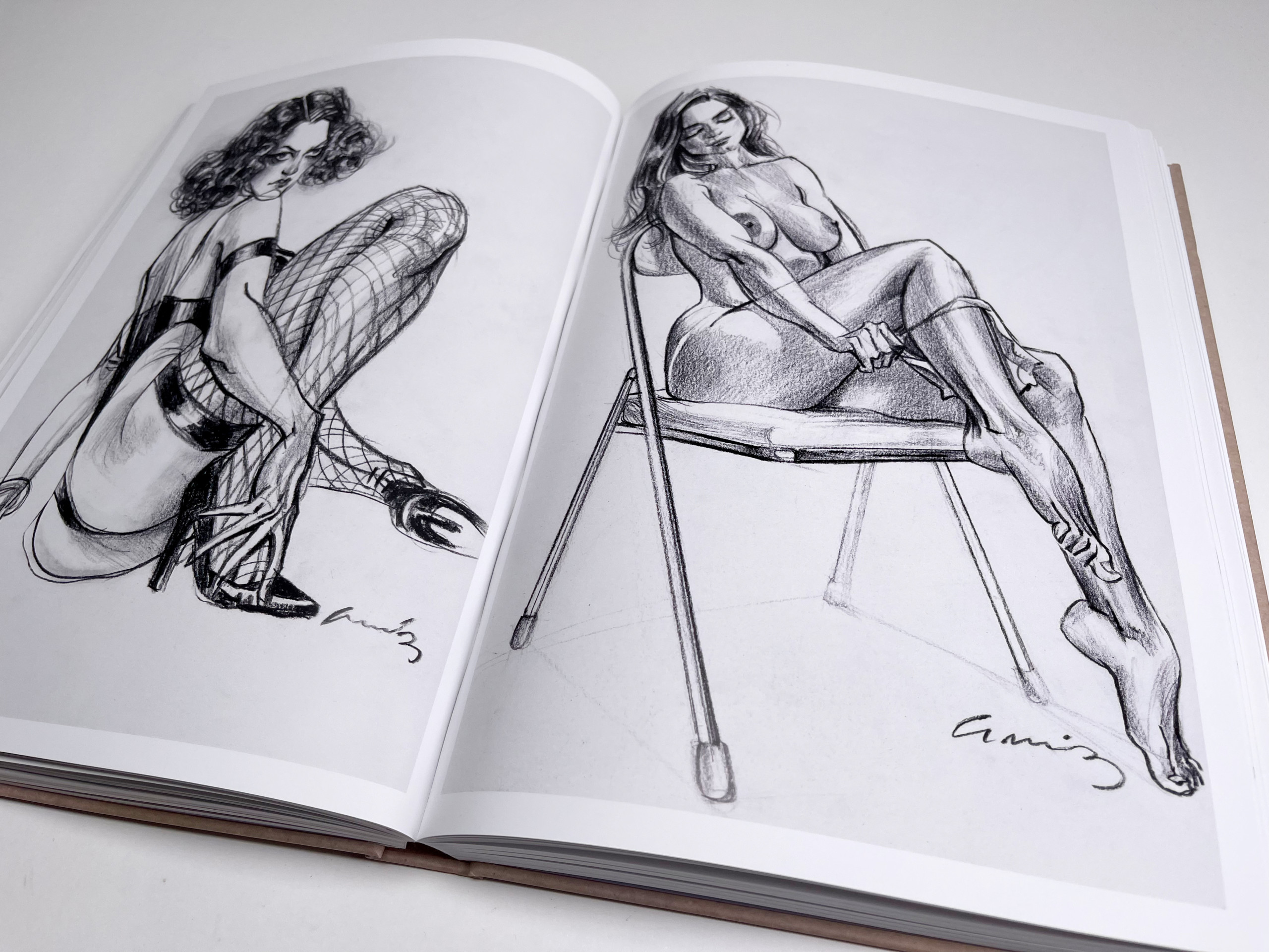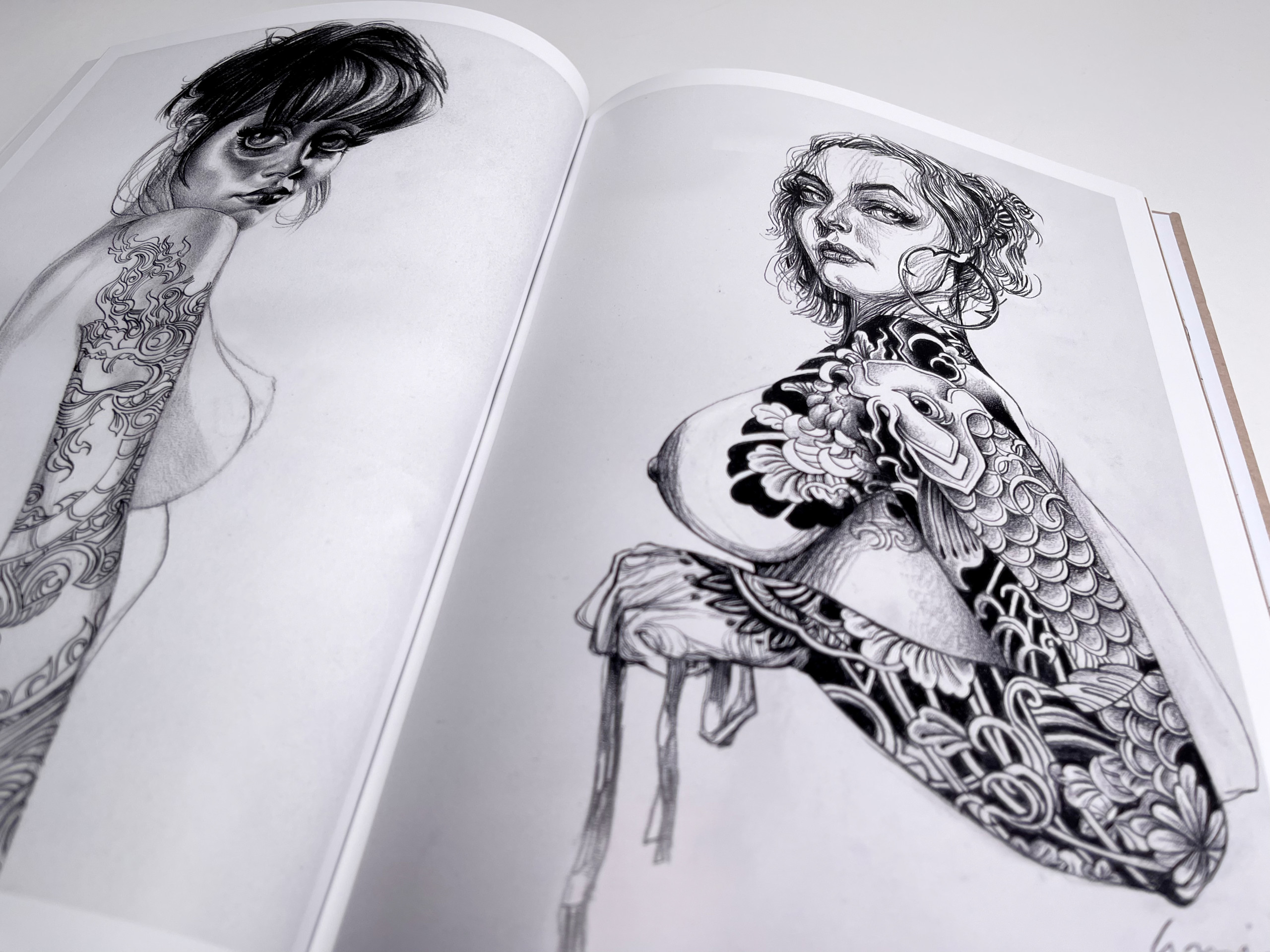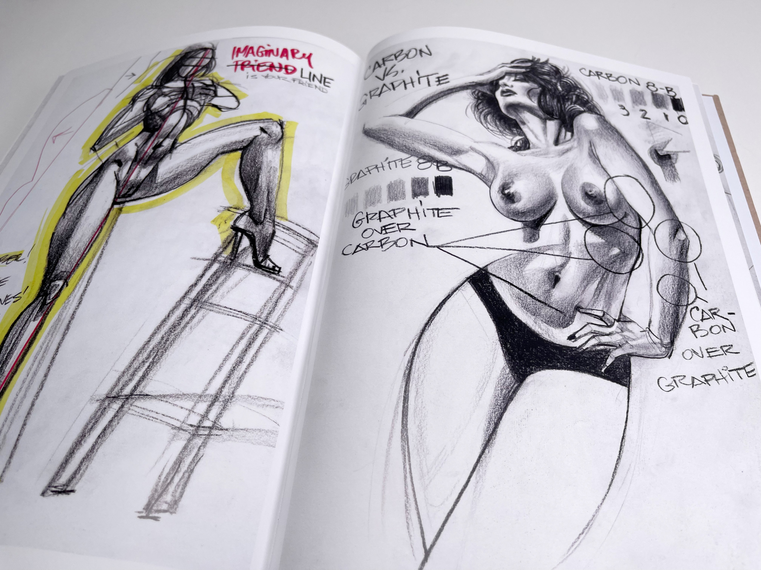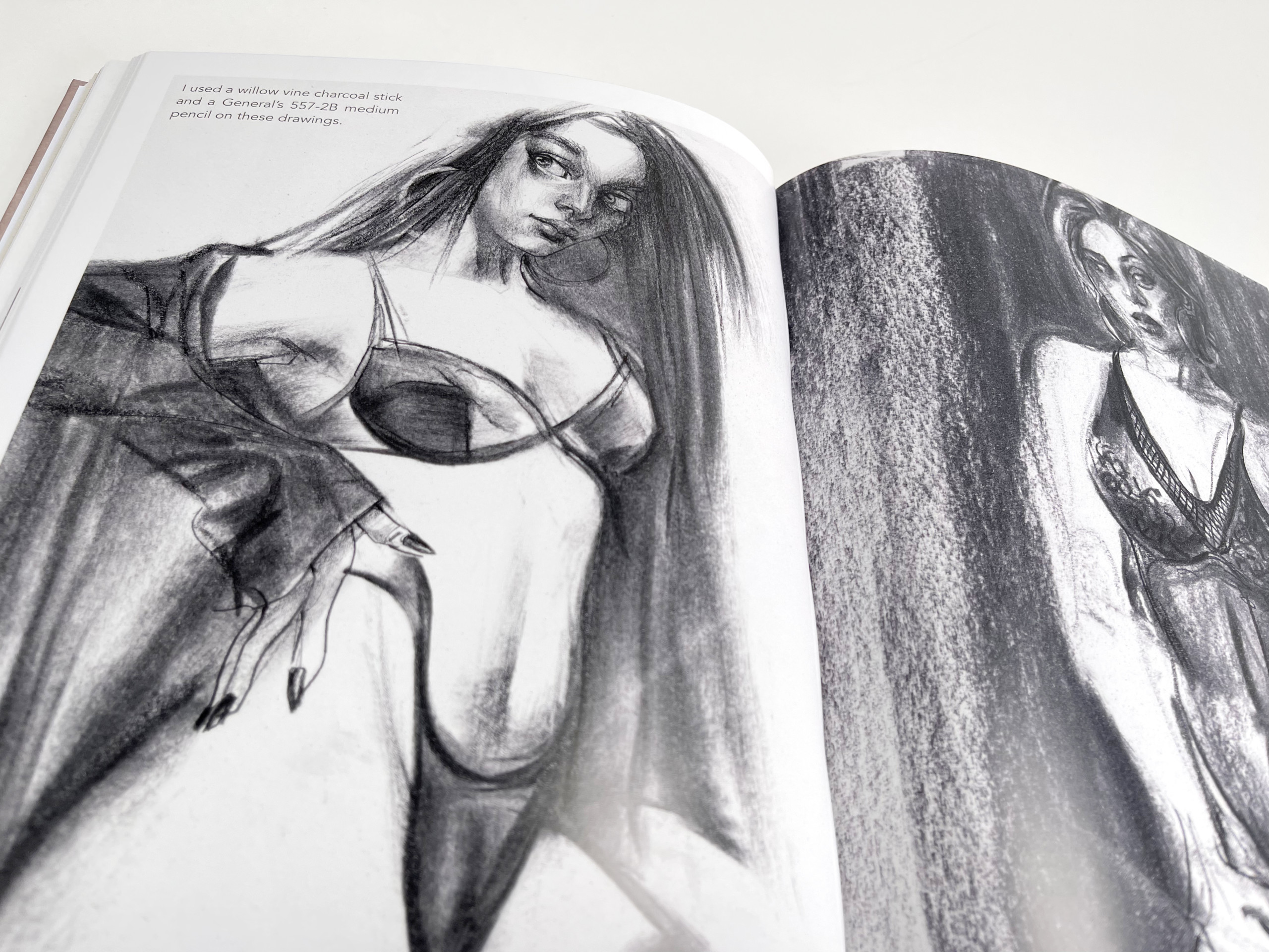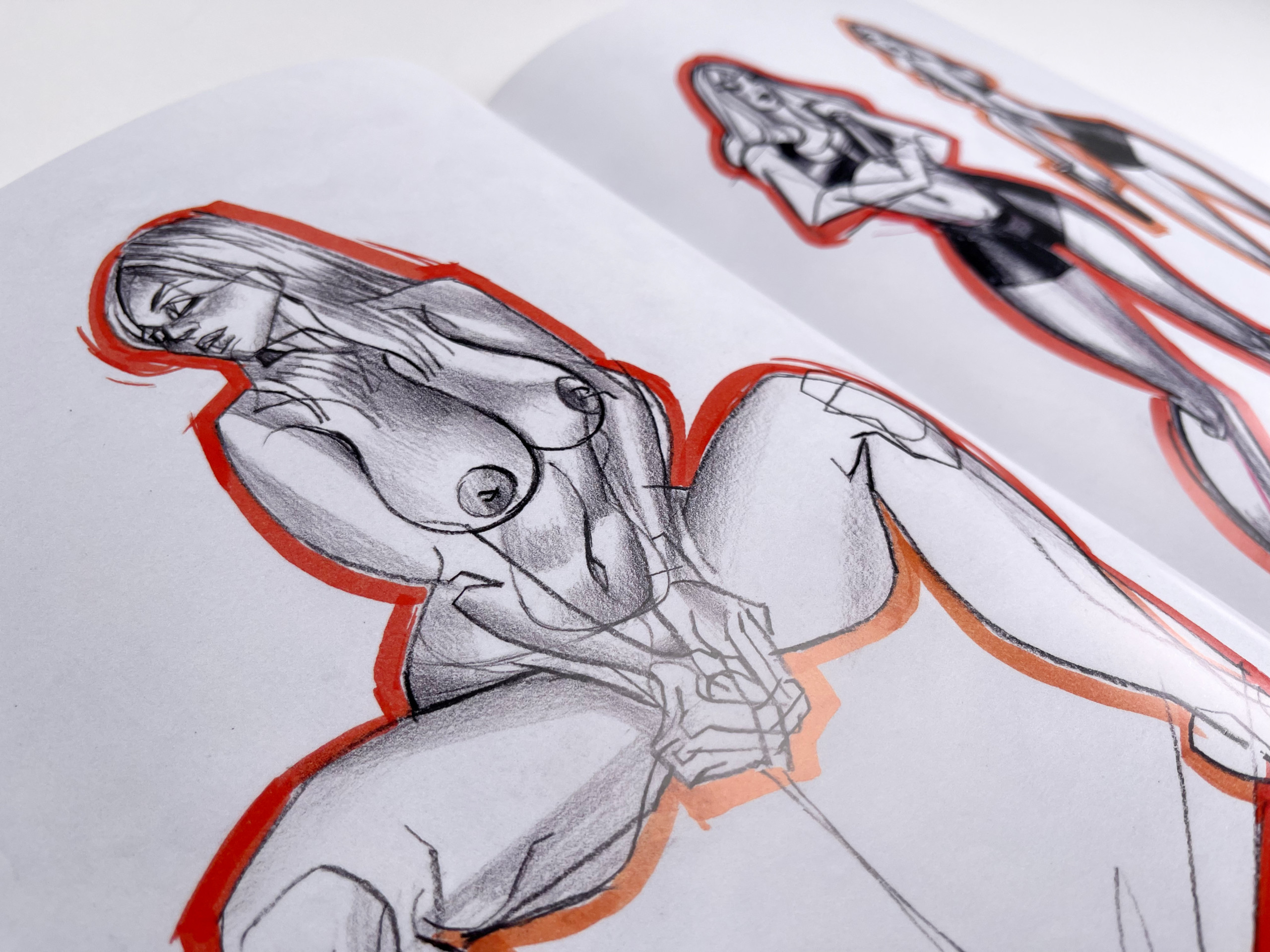 Line & Mass regorge d’esquisses et d’œuvres d’art déjà terminées, créées avec des médiums traditionnels. Il s’agit d’une sélection d’œuvres et de travaux qui s’étalent sur les 10 dernières années. Au gré des chapitres, Alberto nous montre quelques uns de ses travaux favoris, ses approches personnelles et nous raconte quelques anecdotes sur la création de ses œuvres. En outre, il partage certaines des notes qu’il a prises au cours de ses classes sous forme de croquis et d’explications, ainsi que des dessins et gribouillages. Dans tous les cas, ce livre est 100% Alberto et ceux d’entre vous qui sont familiers avec son travail auront un aperçu de son travail et de son processus créatif. Le tout dans un pavé de 400 pages !