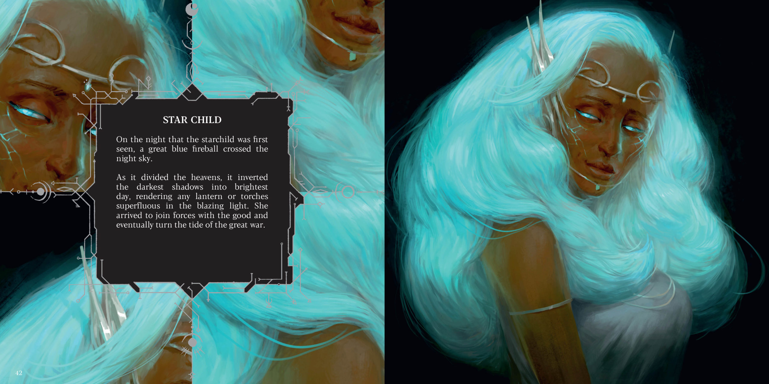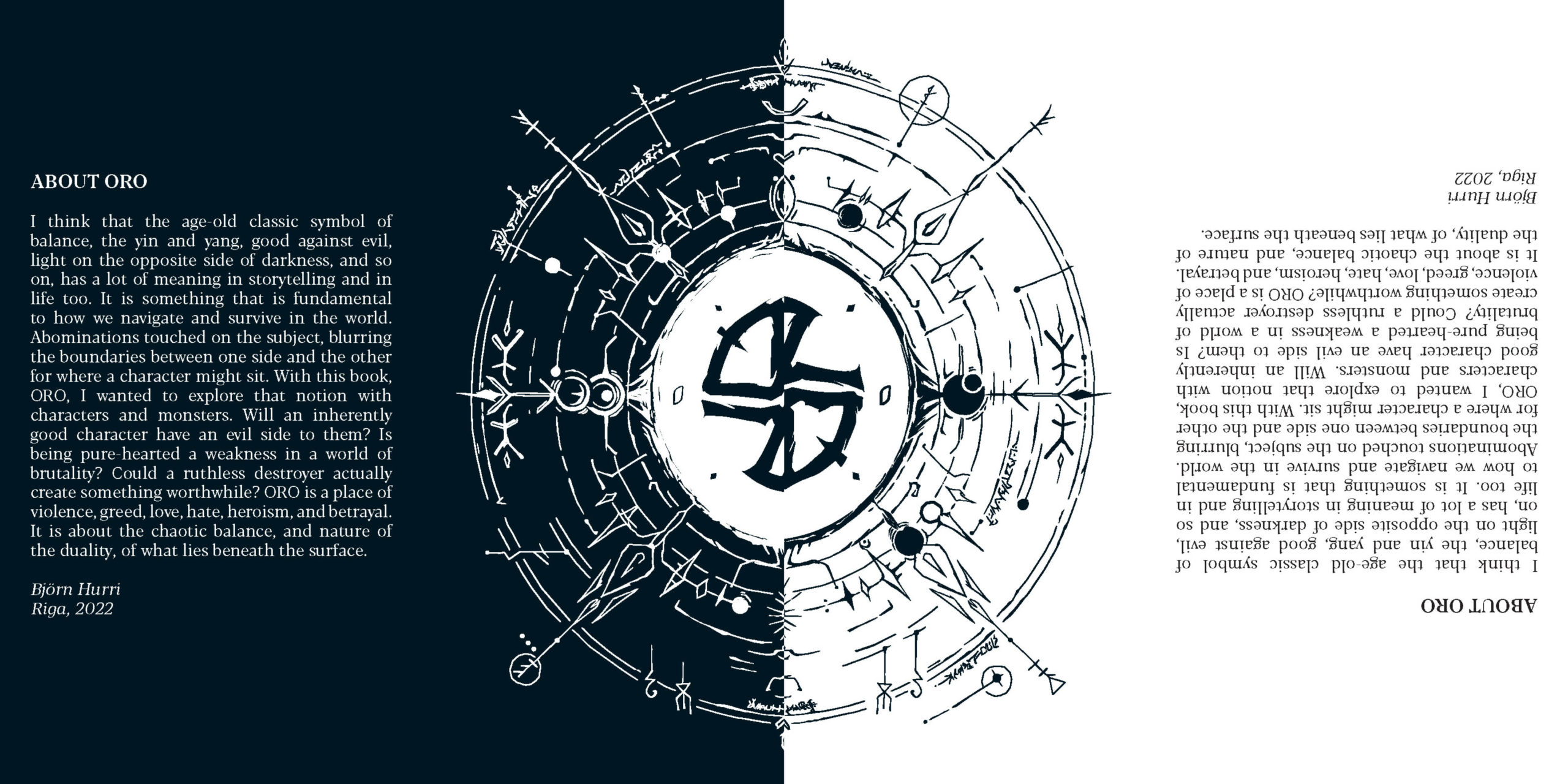 Sa particularité : chacune des deux faces et couvertures fait office de passerelle vers les royaumes de la lumière ou vers les royaumes de l’obscurité. Il suffit de tourner le livre et d’explorer l’univers ORO de Björn .