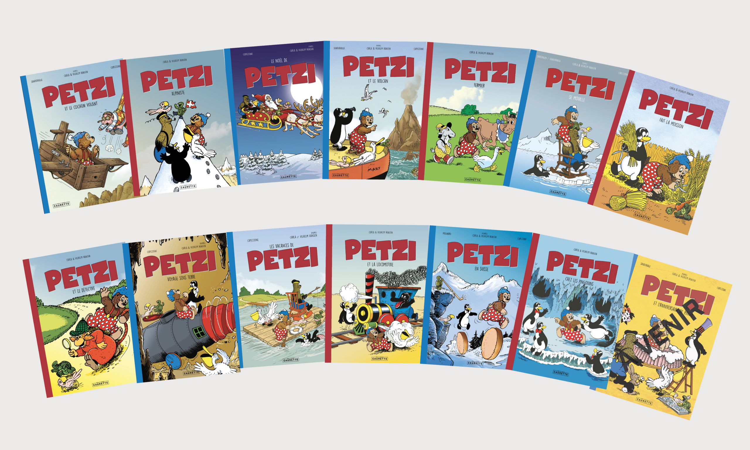 La « collection Petzi » est constituée de rééditions mais également de nouveautés ! Thierry Capezzone nous régale d’histoires inédites telles que Petzi en suisse sorti en 2025. Les nouvelles et anciennes éditions se distinguent par la couleur de leur dos :
