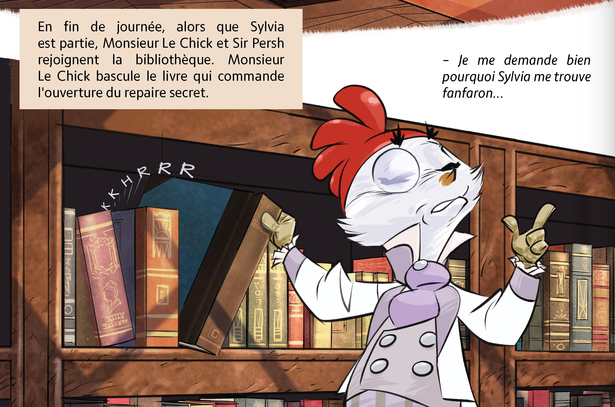 Alors que, quelques pages plus loin, nos héros s’apprêtent à entrer en action, vous remarquerez qu’ils ont bon goût en termes de lecture puisque le livre que Monsieur Le Chick actionne pour ouvrir le passage secret est un livre CAURETTE reconnaissable à son logo (le [C]). Ce passage secret couine un peu, d’une façon bizarre en se refermant puisqu’il fait un bruit ‘à l’envers’ !